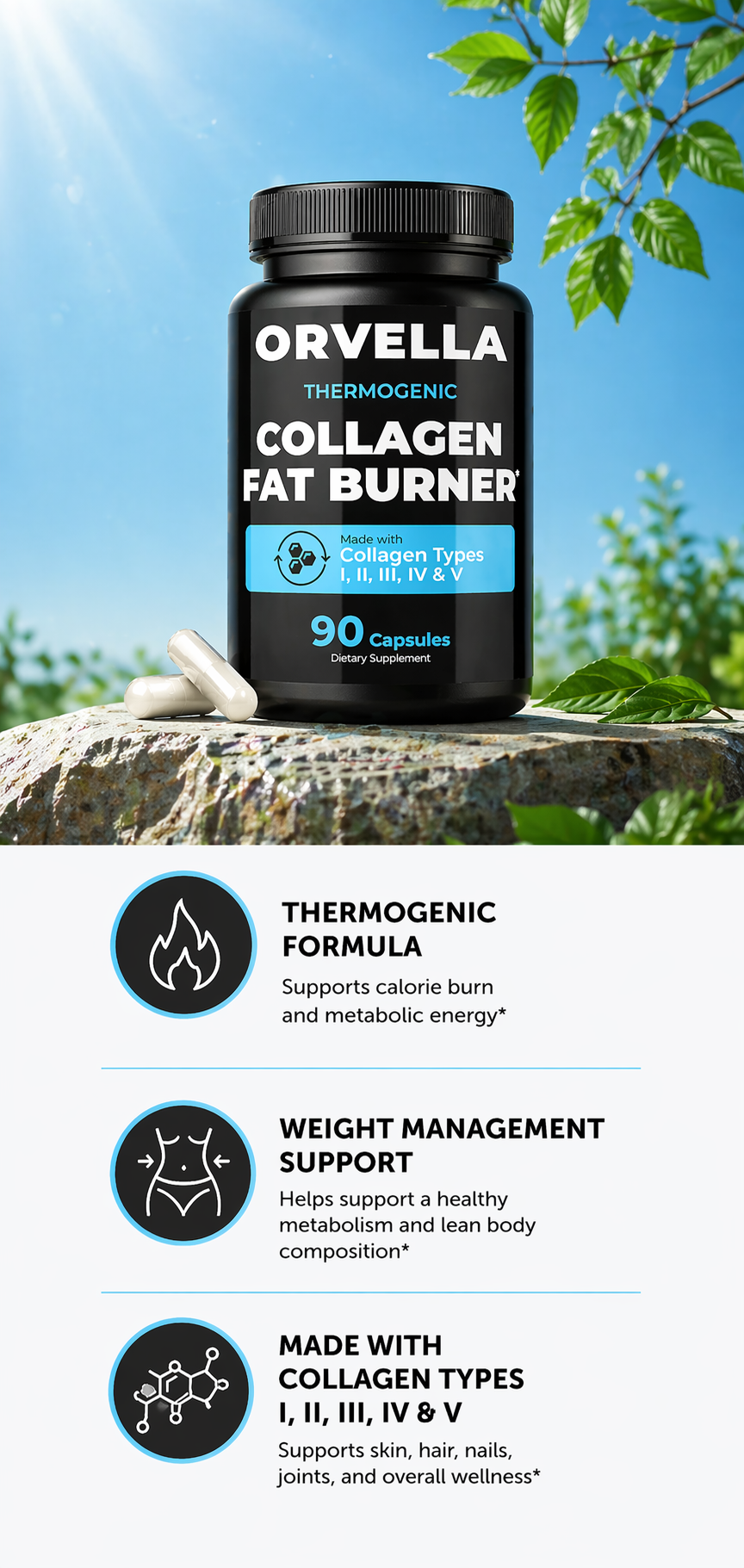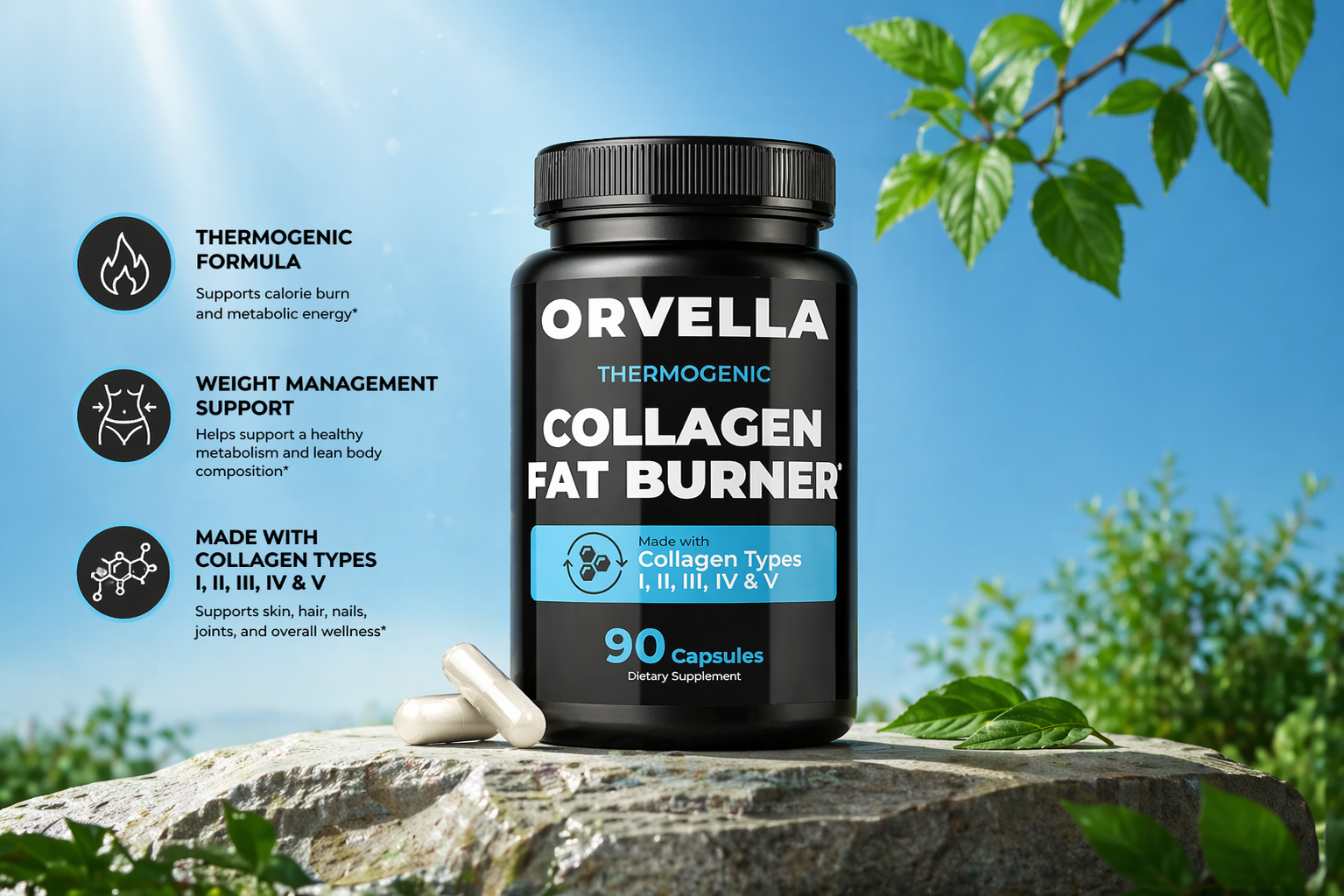 Skip the Gym! Orvella's Thermogenic Collagen Fat Burner targets stubborn fat, crushes cravings, and restores your skin, hair, and nails from the inside out.